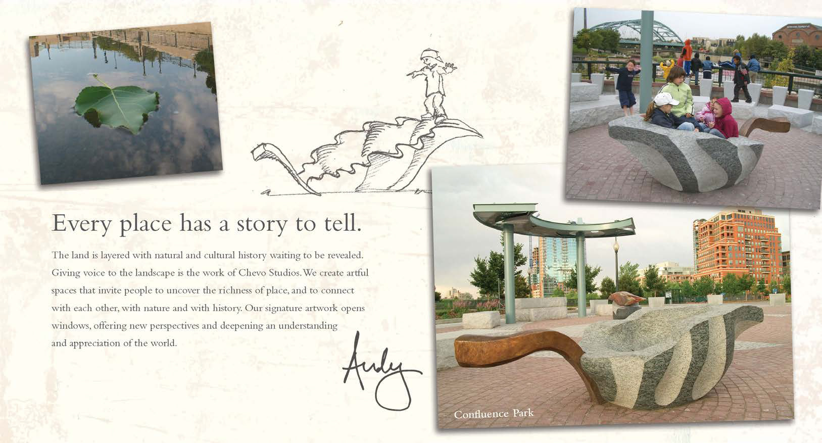 Booklet for prospective interpretive public art (Design/layout). (Images and copy by Andy Dufford/Chevo Studios, Carolyn Hales and Steve Miller)