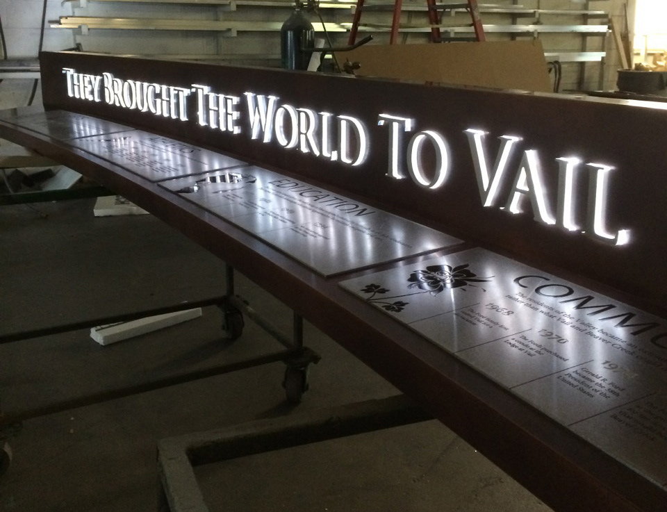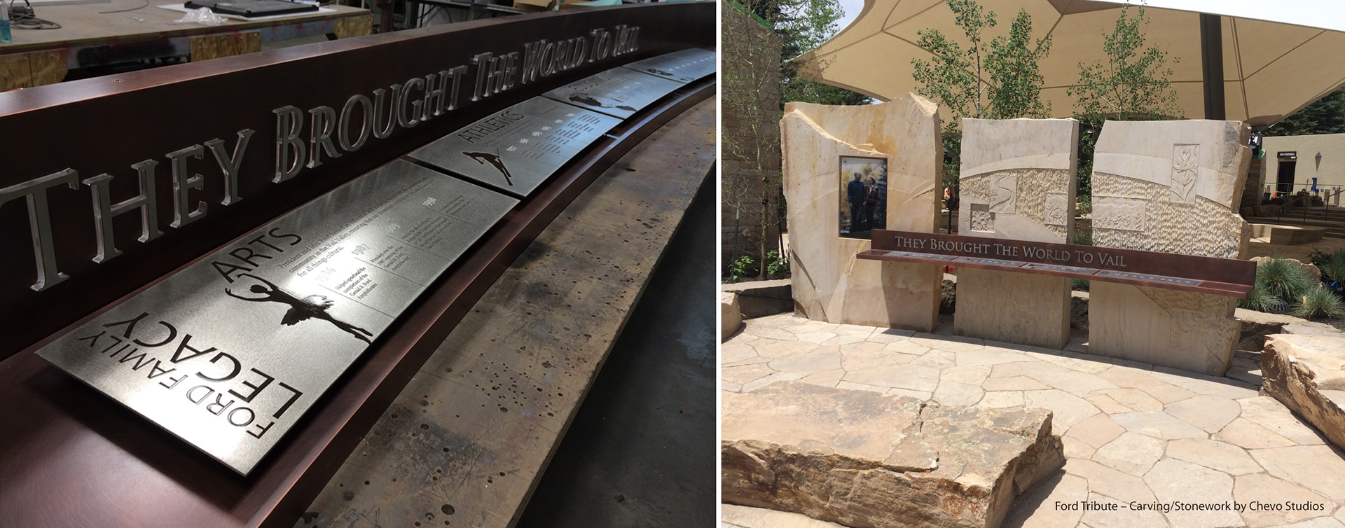 Design/Layout of etched Stainless Steel plaques marking the contributions from the Fords – Ford Amphitheater, Vail, CO (Work with Andy Dufford/Chevo Studios and Jesse Oman, Independent Sign)